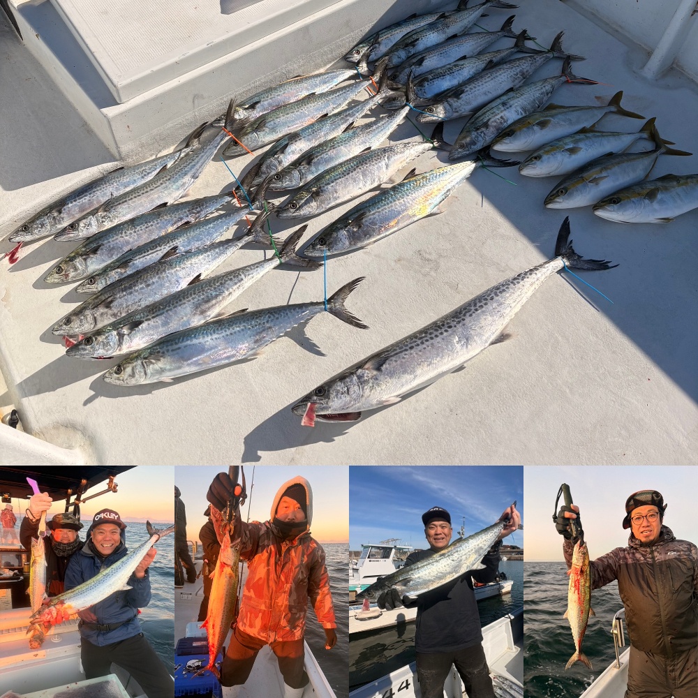 前回、悔しい思いをされた方達は今日はリベンジマッチ!朝は風が少し強い状況でしたがスタートから当たりが連発!おー今日は魚の機嫌がいい😆ヒットー!いいひき!上がってきたのは良型サワラ!やったー!リベンジ成功👏更にヒットー!こちらもリベンジ成功👏よーし!!その後もコンスタントにヒット!ちょっと渋くなったタイミングで、ミノーで1本獲れたのはしびれました🤩ご乗船ありがとうございました!差し入れありがとうございます🙇