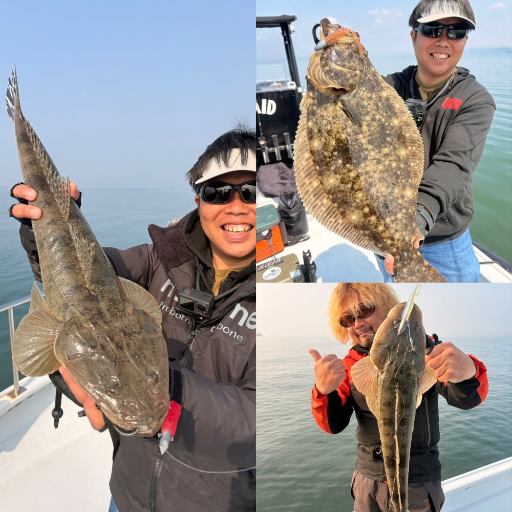 スタートしてしばらくするとヒットするも合わせ切れ!更にヒット!次はバッチリGET!その後は当たりはあるものの中々ヒットしない状況でしたがポイントを移動するとヒット!上がってきたのは良型マゴチ今シーズン初のマーゴン(61㎝)登場!ヒットルアーは『ディープバイト』更にポイントを移動すると良型ヒラメがヒット!やったー👏明らかに春の海になってきましたよー🌸ご乗船ありがとうございました!