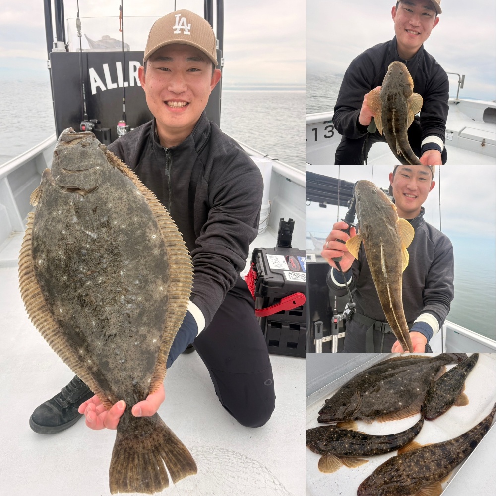 開始1投目からマゴチヒット!すごい。今シーズン最速!更にすぐに2匹目もヒット!やったー!今日はいい感じかなっと思ったらその後は当たるも乗らない状況が続き、ポイント移動!そこで、ヒットー!見えてきたのは良型ヒラメ。デカいタモに持ち替えて無事にGET。64.5㎝の肉厚良型ヒラメ登場!自己新記録おめでとうございます👏ただマゴチ初挑戦の方ヒットならず!またリベンジお待ちしています🙇♂️ご乗船ありがとうございました!差し入れありがとうございます😊