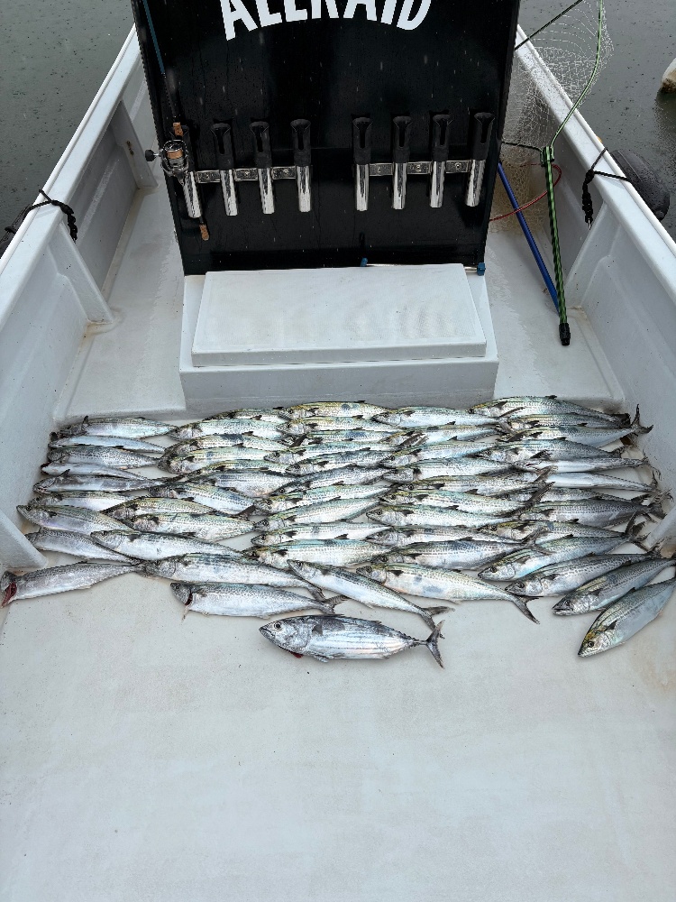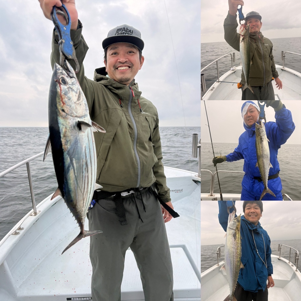 サワラキャスティング風、雨の中出船しましたー!はい✋サ族入れ食いー😆釣れる!釣れる! 船内、血まみれでしたが雨のおかげで自動掃除🤣そして、最近湾奥に入ってきている本カツオも登場!背中が青くてかっこいい!結果、サゴシ大、中、小、合わせて55本+本カツオ1本でした!雨の中ありがとうございました🙇差し入れありがとうございます😊