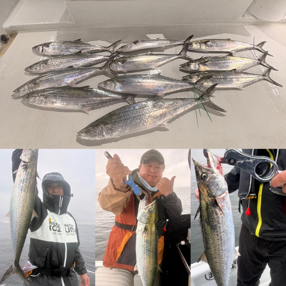 午後サワラ便午後も雨でしたが、魚探にはめちゃくちゃ良い反応!皆さんに頑張ってキャストしていただき、バレやカッターも多数ありましたがバッチリヒットー👍途中からボイルも発生。ボイルにキャスト!ヒットー!気持ちいいやつ😆やっぱり、ナブラなボイルはテンション上がりますねー!雨の中、暗くなるまでキャストありがとうございました🙇差し入れありがとうございます😊