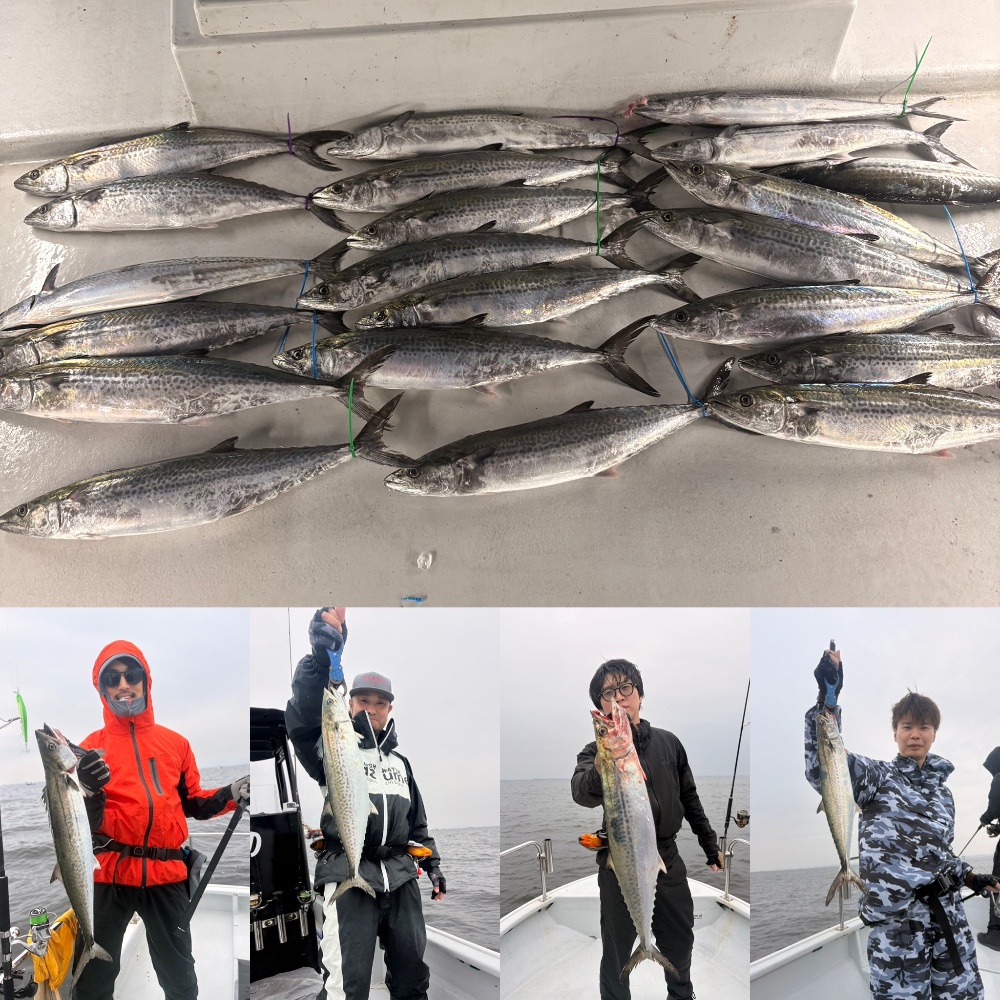 サワラキャスティング 午後スタートからコンスタントにヒット!ただバレも多発😂初挑戦の方もバッチリヒット!目標、3匹との事でしたが4匹釣れましたー!もうこの釣りにハマってしまいますね😏皆さんが魚かけた時の、ドラグのジーって音は何回聞いてもいいですねー🥹雨の中ご乗船ありがとうございました🙇差し入れありがとうございます😊